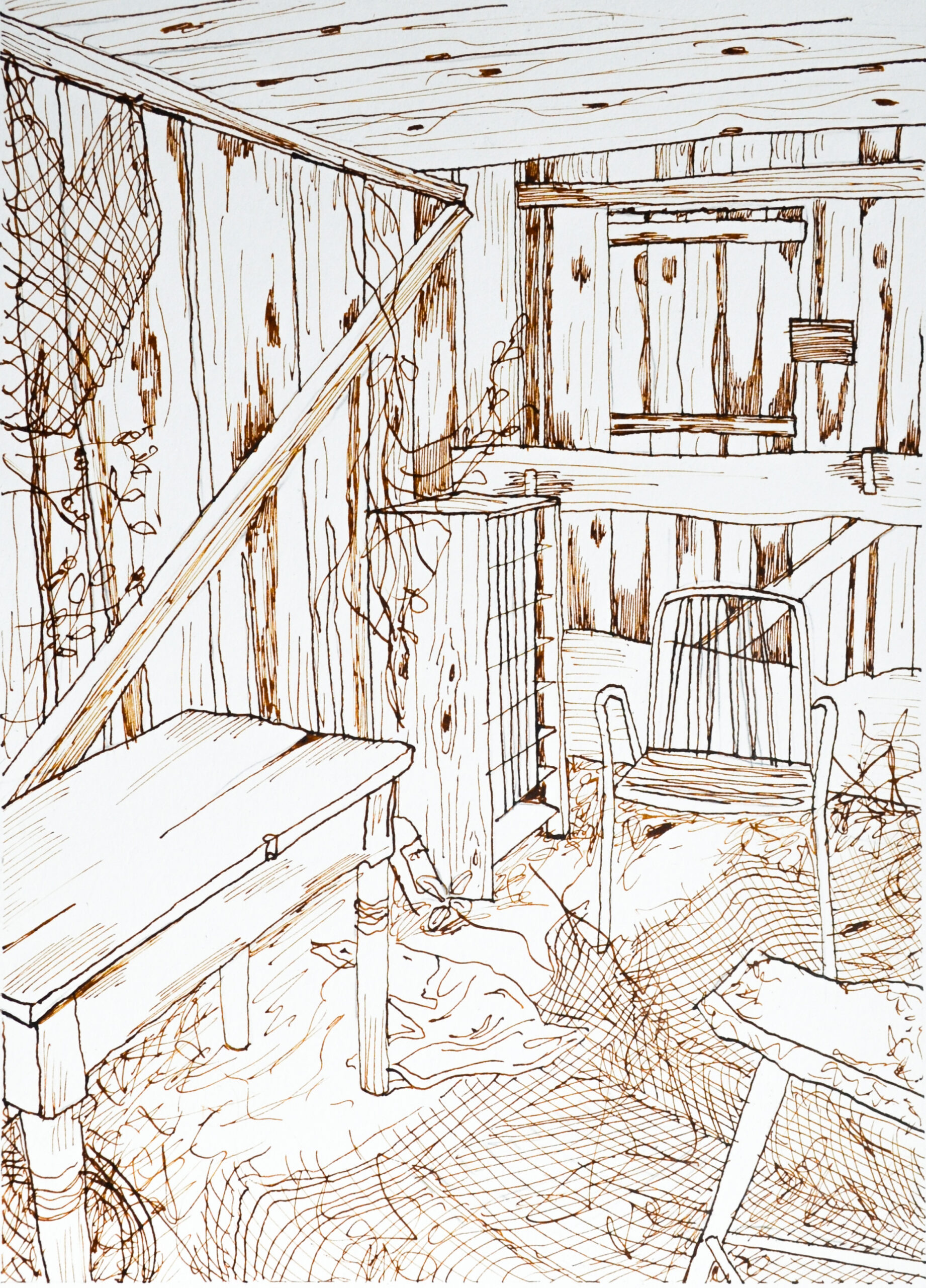 Dieser Prozess verdeutlicht, wie alltägliche Räume und Objekte durch den Einfluss von Zeit und Natur ästhetisch neu kontextualisiert werden können und dadurch zusätzliche Bedeutungsebenen erlangen – ein Aspekt, der in den Illustrationen veranschaulicht werden soll. Die Darstellungen dokumentieren die Innenräume in ihrem verlassenen Zustand und wurden auf Papier mit Tusche ausgeführt.