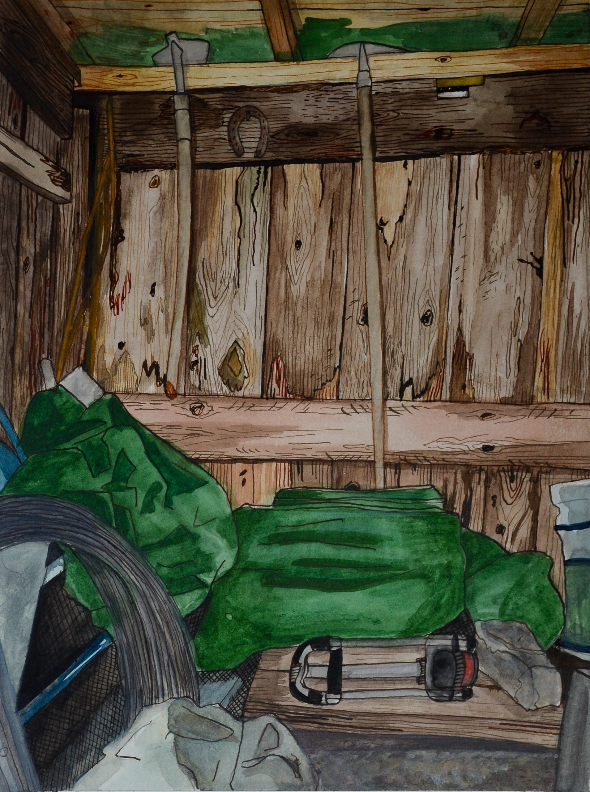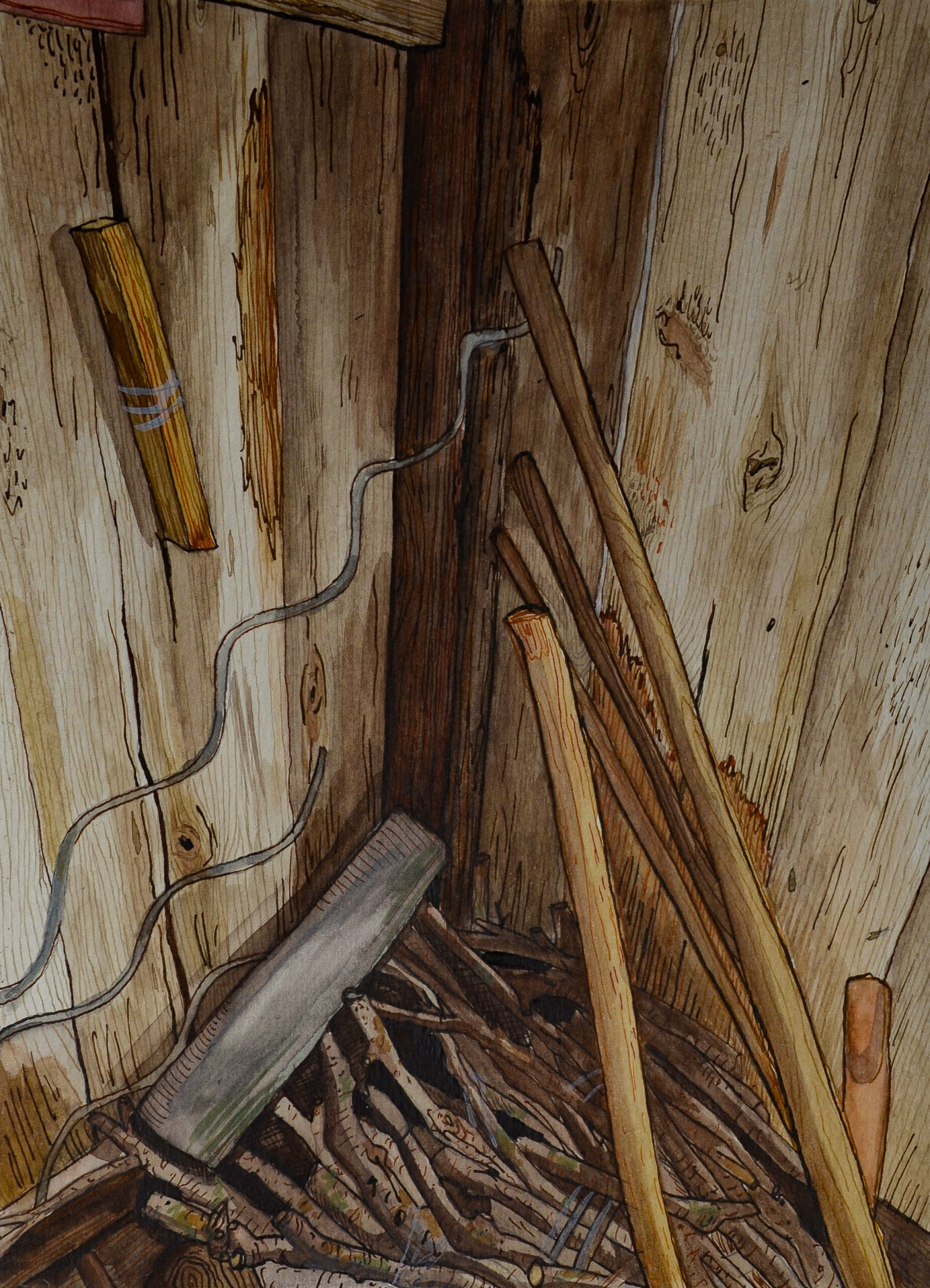 Im Rahmen meiner künstlerischen Recherche stieß ich bei den Begehungen der Bisamberger Weingärten oft auf leerstehende und unverschlossene Hütten, die dadurch zugänglich wurden und einen Einblick in ihre Innenräume ermöglichten. Im Inneren fand sich häufig eine scheinbar zufällige Ansammlung von organischen und anorganischen Materialien. Darunter befanden sich Werkzeuge, kleinere Geräte und Materialien für den Weinbau.