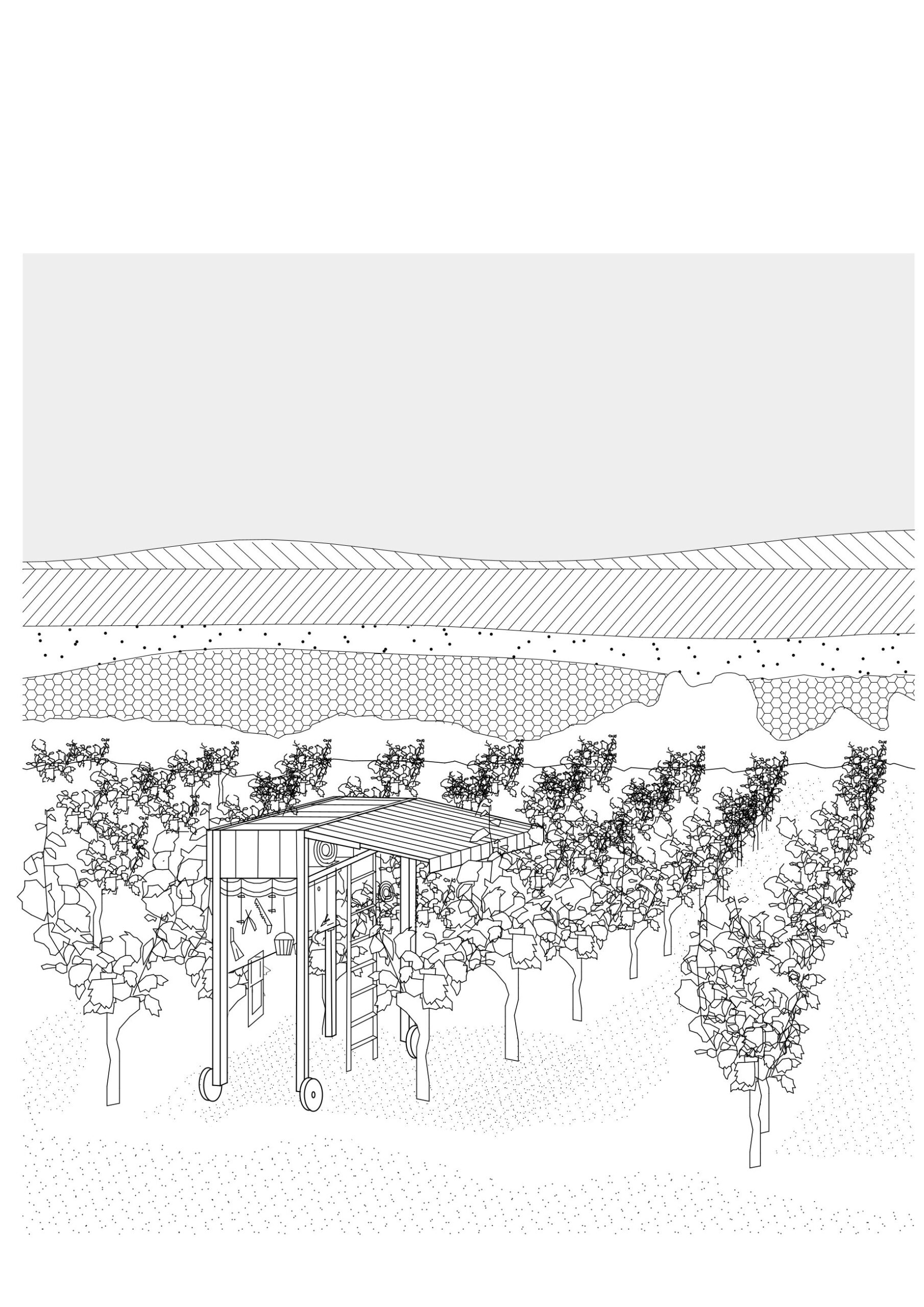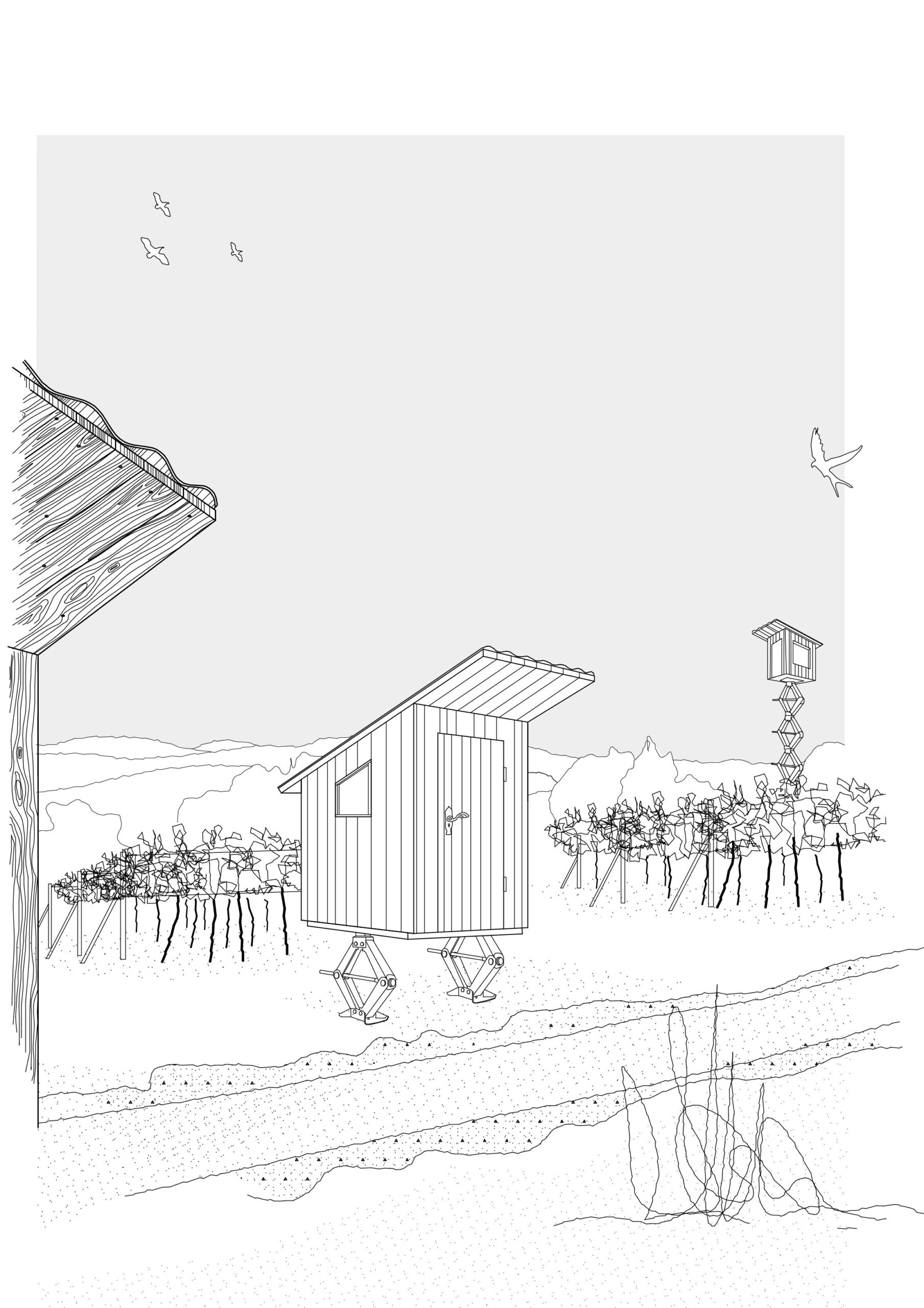 In anderer Art und Weise der Bewegung ladet nun aber die Position der Hütte ein, um ein Moment des movere zu verorten – die Gemütsbewegung mag von nostalgischer Natur sein, das Material bewegt und wieder bewegt. Der Standort aber lässt sich durch die Wiederholung der Zeile vielleicht auch verschieben – gleich einer Zugschiene lässt sich die Hütte gedanklich entlang der Struktur, entlang dem Gerüst schieben und neue Positionen können erdacht werden. Und nicht zufällig werden manchmal auch alte Anhänger, Zugwaggons oder Wohnwagen als Hütte abgestellt und weitergenutzt, am Weg der Weingartenzeile, am Weg zu einer anderen Nutzung, vielleicht auch nur als Zwischenstopp bevor die Reise weitergeht. Die scheinbare Mobilität möchte ich in dem unzufälligen zufälligen Moment entlang des Weges sehen, der durch die strikte eingestrickte Weinranke aufgespannt wird.