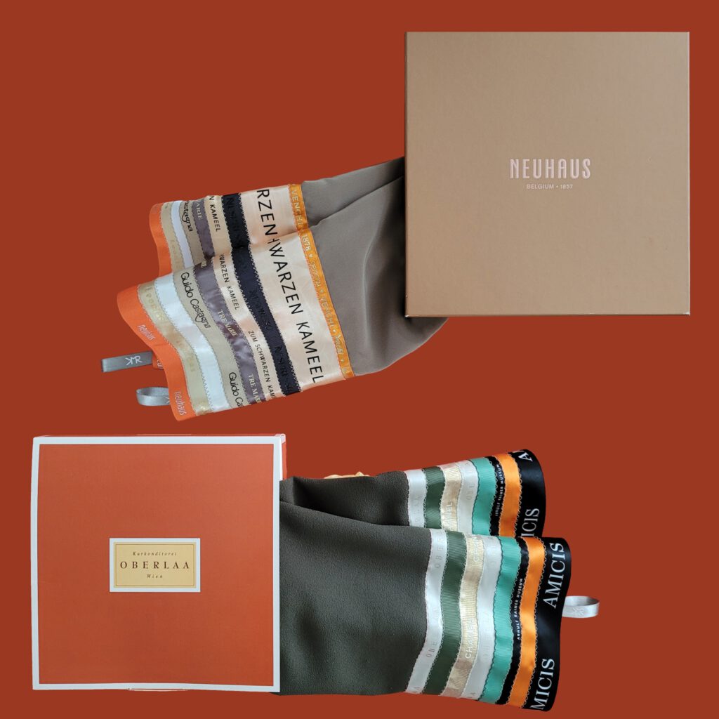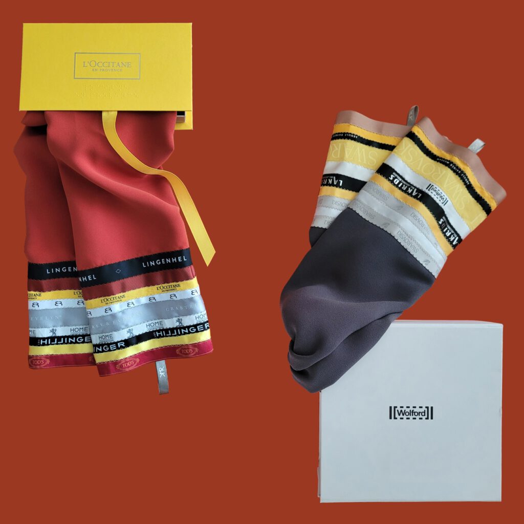 Schals mit ca. 15cm breiten Bordüren aus unterschiedlich breiten Branding-Bändern